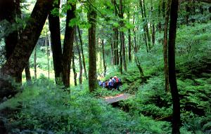 | いわれ:安蔵寺山はいわば本州の背骨の山が途切れるところにある。この地域は地層も古く硬い岩をえぐるように川が流れ他とは 違った生物達も見られる。安蔵寺山の山頂付近の尾根は第一級の自然保護区となっており植物の採取も硬く禁じられている。 また、ブナやミズナラがあり多くの水の恵みを私達に及ぼしてくれる。 この山頂近くの寺屋敷あとには昔安蔵寺という寺があったとされこれを含め安蔵寺五蔵寺と呼ばれた。このいずれの寺にも素朴な木の仏像があり、神通力を使い川を上ったとされている。 このような山岳仏教のあった周辺には温泉や鉱物の鉱脈がある場合が多くこの地域でも大掛かりな銅の産出があった。 |